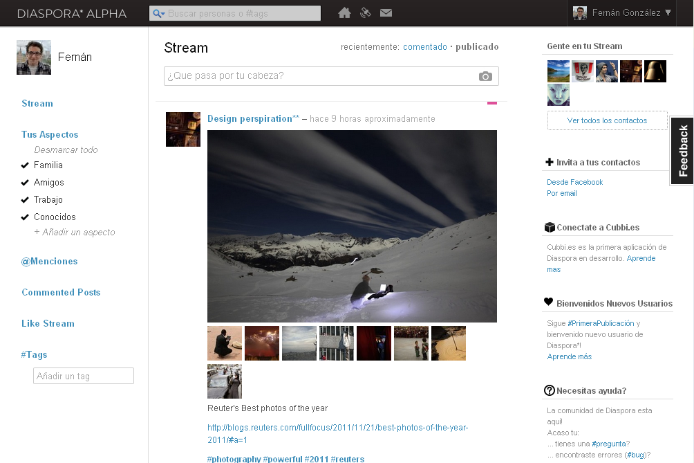 De momento la situación actual es un poco triste, pues no hay apenas gente, de hecho se puede conectar con Facebook  y, como era de esperar, de mis más de 100 amigos en Facebook ninguno está registrado en Diaspora*. Por el momento y para que no aparezca el «stream» o muro vacío, por defecto aparecen las actualizaciones de la llamada «Comunidad creativa», personalmente no le encuentro sentido a esto último.
