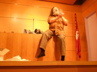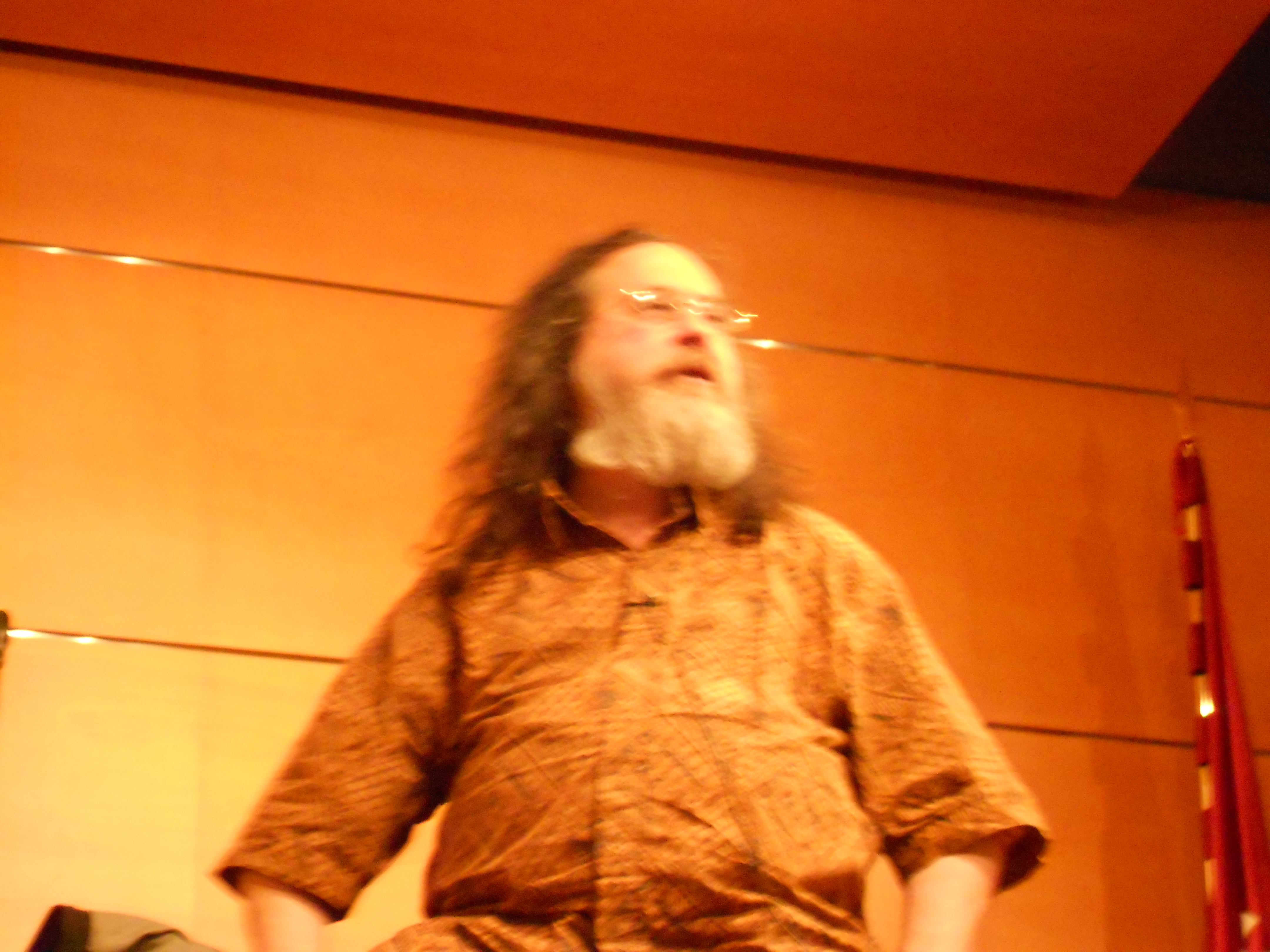 Fue bastante gente, pero no de forma tan masiva como en otras ocasiones. El título «Copyright vs. Comunidad» ya indicaba que sería su discurso tipo que tantas veces había escuchado por streaming: empieza con las 4 libertades del software libre y termina con la subasta del ñú, pasando por el momento de quitarse los zapatos, el guiño a la audiencia con el «¡No a la Ley Sinde!  y ¡no a la SGAE!» o varias latas de Pepsi.