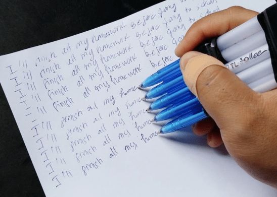 Si alguna vez tienes la necesidad de escribir varias veces un mismo texto, con varios bolígrafos unidos se puede hacer. Sorprendentemente funciona. Sí, ojalá haber sabido esta artimaña en Primaria cuando había este tipo de castigos.